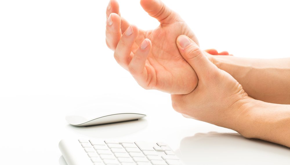 Working too much - suffering from a Carpal tunnel syndrome - young man holding his wrist in pain due to prolonged use of keyboard and mouse over white background (color toned image; shallow DOF)